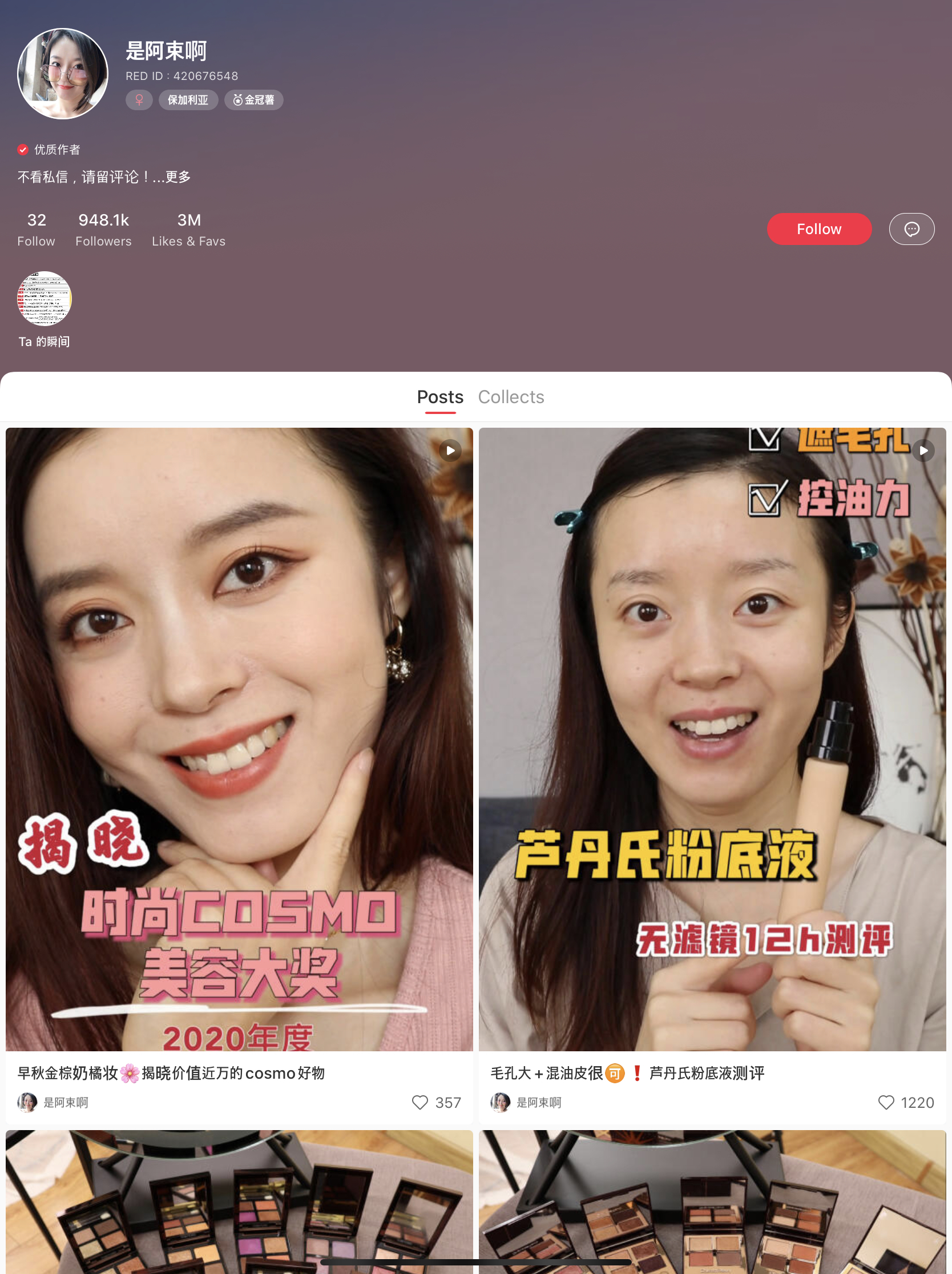 또 다른 모범사례로 87만 명의 팬을 보유하고 있는 뷰티 왕홍 "是阿束啊"의 아르마니 파운데이션 테스트 콘텐츠입니다.